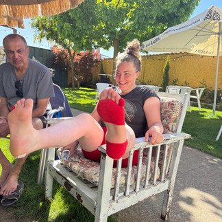 I know I have written many times about kindness I observe on the Camino. Perhaps with the risk of sounding repetitive, below is a Dutch lady (forgot her name) who is a physiotherapist treating fellow pilgrims that she knows and doesn’t know for their blisters. She did this for 3 hrs straight after arriving to our albuerge on her own Camino. As blisters need airing out she also gave appointment times from 5am till 7am for people who needed to air out their feet for the next day. Nothing expected in return. Second photo is a Dutch girl that I judged to be too loud when I met her 3 weeks ago with Amy on day 2. Feel ashamed of thinking that as she is the sweetest Dutch on the Camino. Right after her feet got treated by the other lady. The third photo is the pet turkey of the albuerge.